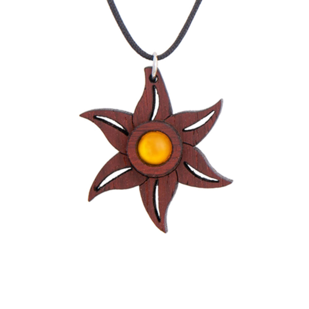 Ξύλινο μενταγιόν από ξύλο παντούκ σε σχήμα αστερία με στρογγυλό κίτρινο καμπουσόν στη μέση, σε διάσταση περίπου 38 mm