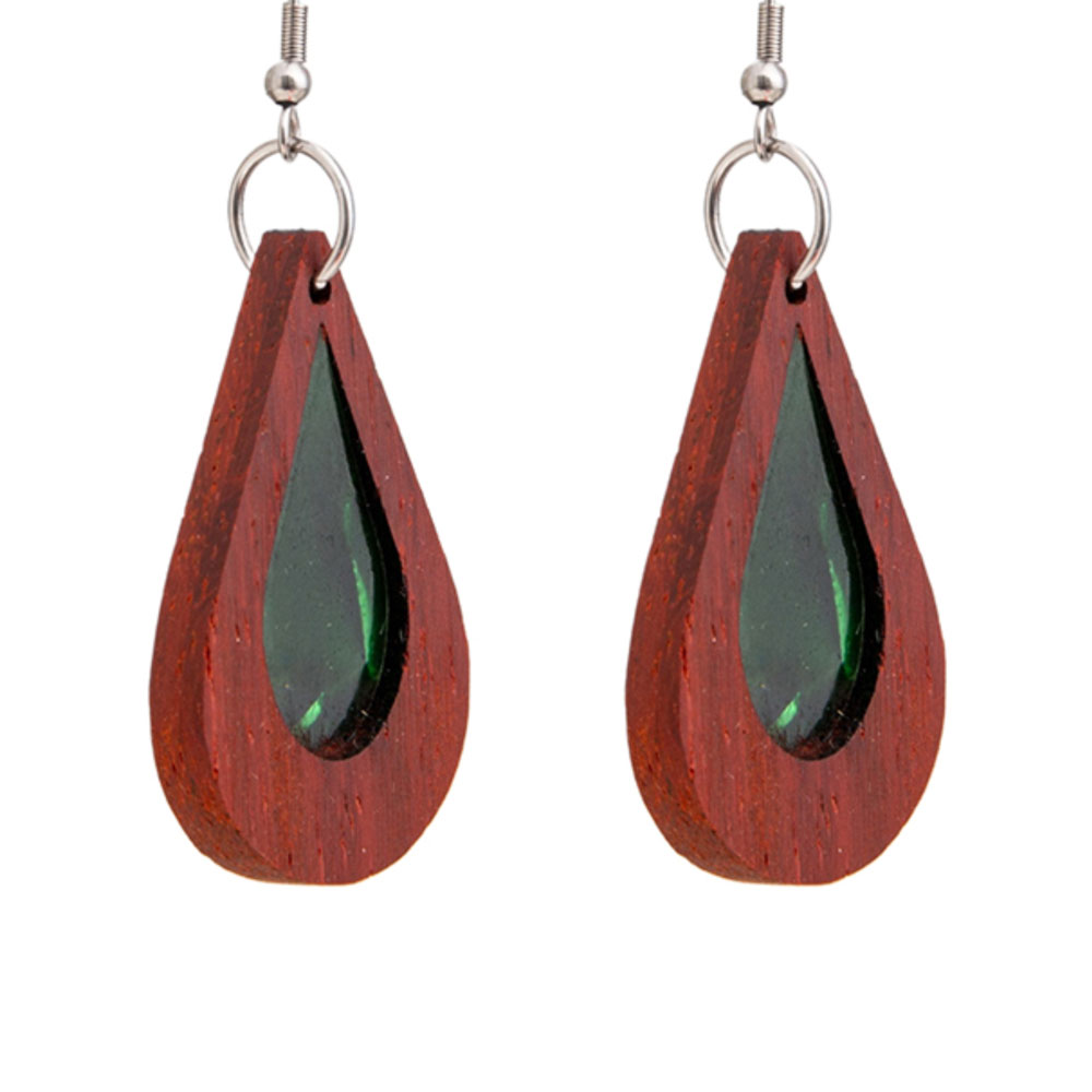 Ξύλινα σκουλαρίκια σε σχήμα σταγόνας με πράσινο όστρακο από ξύλο παντούκ και φινίρισμα με κεραλοιφή.